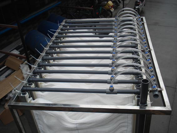 大量氣泡以較高速度穿過膜組件以及氣體夾帶的水流對膜表面的沖刷作用,使膜表面處于劇烈紊動狀態(tài),避免了凝膠層的增厚和堵塞物質(zhì)的積累,可延長膜清洗周期。同時(shí)這種紊動作用還從兩方面減緩了濃差極化現(xiàn)象,一是通過曝氣提高水流速度,使其處于紊流狀態(tài),讓膜表面的高濃度與主流濃度更好地混合;二是對膜表面不斷進(jìn)行清洗,消除已形成的凝膠層。
