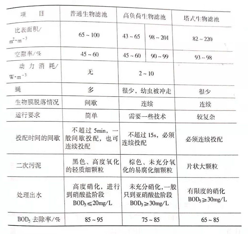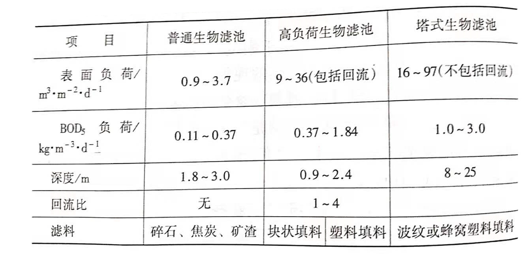 常見(jiàn)的生物濾池有普通生物濾池、高負(fù)荷生物濾池和塔式生物濾池等三種,下面的表格列出了這三種生物濾池的基本參數(shù)。