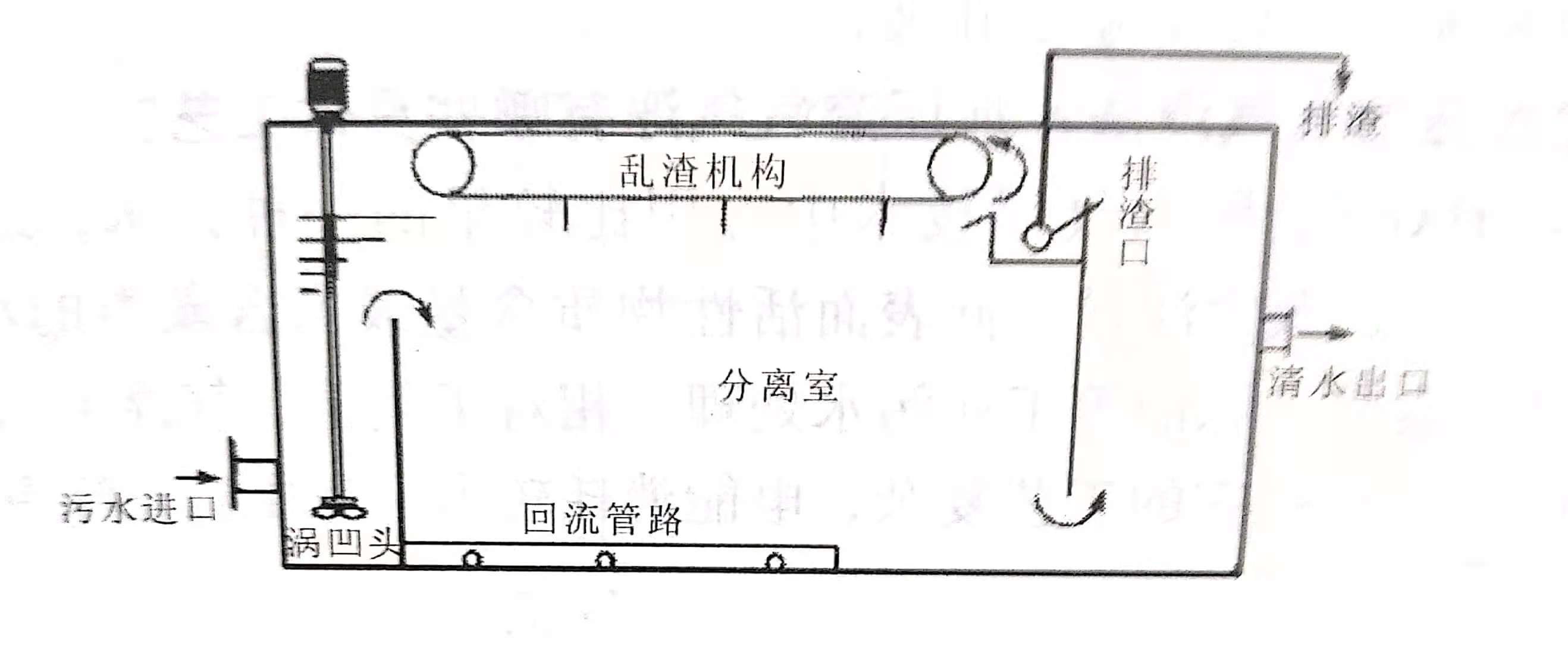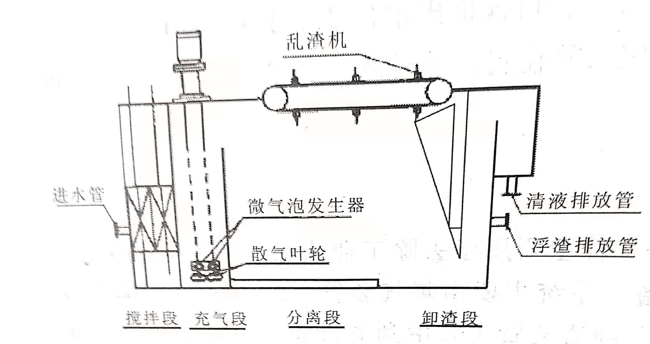 渦凹氣浮稱為旋切氣浮,渦凹氣浮機是一種主要用于去除工業或城市污水中的油脂、膠狀物及固體懸浮物而設計的污水處理設備。系統主要由曝氣裝置、刮渣裝置和排渣裝置組成,其中曝氣裝置主要是渦凹曝氣機,刮渣裝置主要由刮渣機和牽引鏈條組成,排渣裝置主要為螺旋推進器,如下圖所示。工作時,溶氣設備由電機帶動高速旋轉(旋